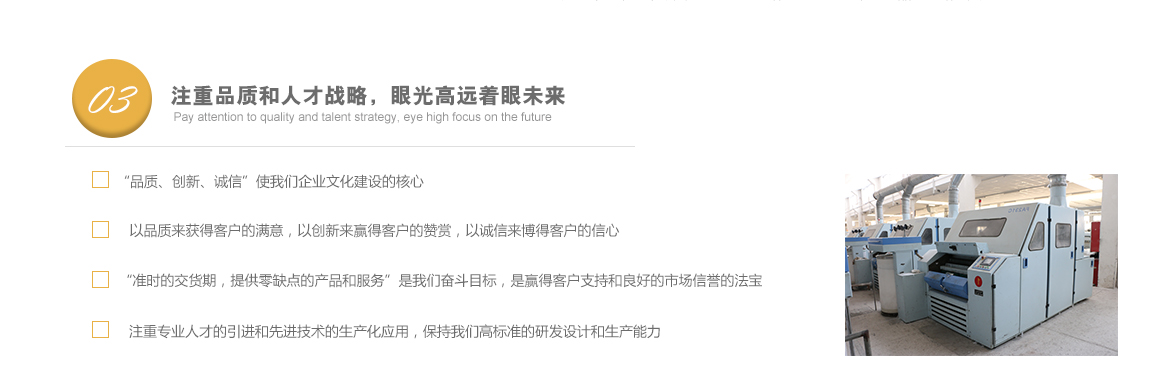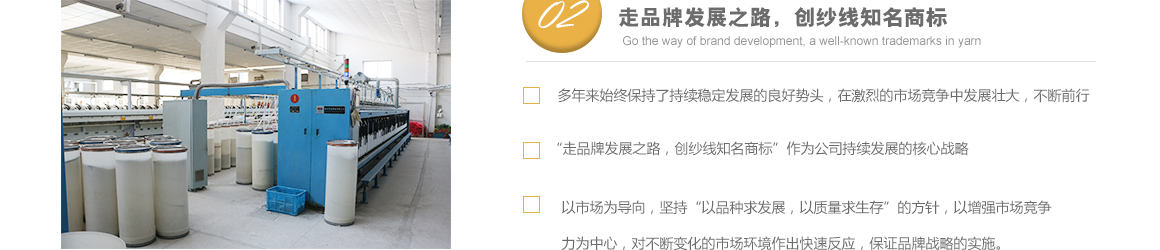 太倉(cāng)市高陽(yáng)工貿(mào)有限公司是專(zhuān)業(yè)從事特種紗生產(chǎn)十?dāng)?shù)年的一線生產(chǎn)廠家,坐落于江蘇省蘇州市太倉(cāng)市雙鳳鎮(zhèn)新湖建湖路29號(hào),太倉(cāng)隸屬長(zhǎng)江三角洲經(jīng)濟(jì)圈,交通便捷,經(jīng)濟(jì)發(fā)達(dá),是著名的紡織生產(chǎn)基地。 公司歷史要追溯到1982年就成立的新湖毛紡織廠。1996年,毛紡織廠與上海二十二棉在新湖聯(lián)合組建了太倉(cāng)市新湖福利綜合廠。2002年為適應(yīng)市場(chǎng)的飛速變化,公司轉(zhuǎn)制重組更名為太倉(cāng)市高陽(yáng)工貿(mào)有限公司。同時(shí)公司適時(shí)調(diào)整生產(chǎn)經(jīng)營(yíng)策略,調(diào)整產(chǎn)品品種結(jié)構(gòu),把生產(chǎn)特種紗作為主要發(fā)展方向,純棉、滌綸竹節(jié)紗是我們的主要產(chǎn)品。 公司多年來(lái)始終保持了持續(xù)穩(wěn)定發(fā)展的良好勢(shì)頭,在激烈的市場(chǎng)競(jìng)爭(zhēng)中發(fā)展壯大,不斷前行。我們把“走品牌發(fā)展之路,創(chuàng)紗線知名商標(biāo)”作為公司持續(xù)發(fā)展的核心戰(zhàn)略。以市場(chǎng)為導(dǎo)向,堅(jiān)持“以品種求發(fā)展,以質(zhì)量求生存”的方針,以增強(qiáng)市場(chǎng)競(jìng)爭(zhēng)力為中心,對(duì)不斷變化的市場(chǎng)環(huán)境作出快速反應(yīng),品牌戰(zhàn)略的實(shí)施。公司注重專(zhuān)業(yè)人才的引進(jìn)和先進(jìn)技術(shù)的生產(chǎn)化應(yīng)用,具備較強(qiáng)的研發(fā)設(shè)計(jì)和生產(chǎn)能力。 公司一直把“品質(zhì)、創(chuàng)新、誠(chéng)信”作為企業(yè)文化建設(shè)的核心。以品質(zhì)來(lái)獲得客戶的滿意,以創(chuàng)新來(lái)贏得客戶的贊賞,以誠(chéng)信來(lái)博得客戶的信心。我們把“準(zhǔn)時(shí)的交貨期,提供零缺點(diǎn)的產(chǎn)品和服務(wù)”作為奮斗目標(biāo),贏得了客戶的支持和良好的市場(chǎng)信譽(yù)。 高陽(yáng)工貿(mào)有限公司愿與廣大客戶加強(qiáng)合作,共享信息,迎接挑戰(zhàn),共同發(fā)展。客戶需求。了解詳細(xì)>>